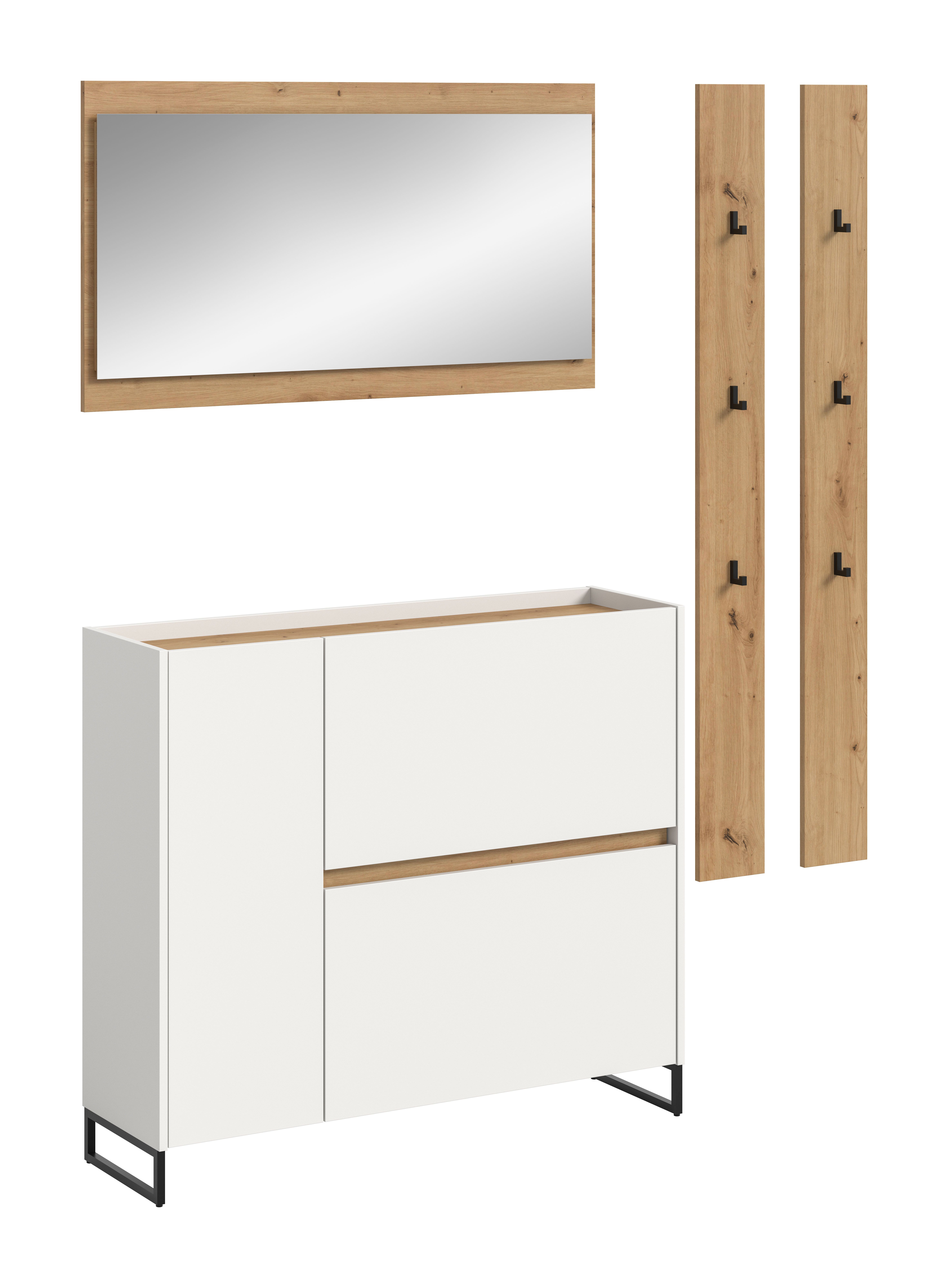 - Ensemble 4 éléments comprenant : 1 meuble à chaussures, 1 miroir, 1 patère murale, 1 patère murale