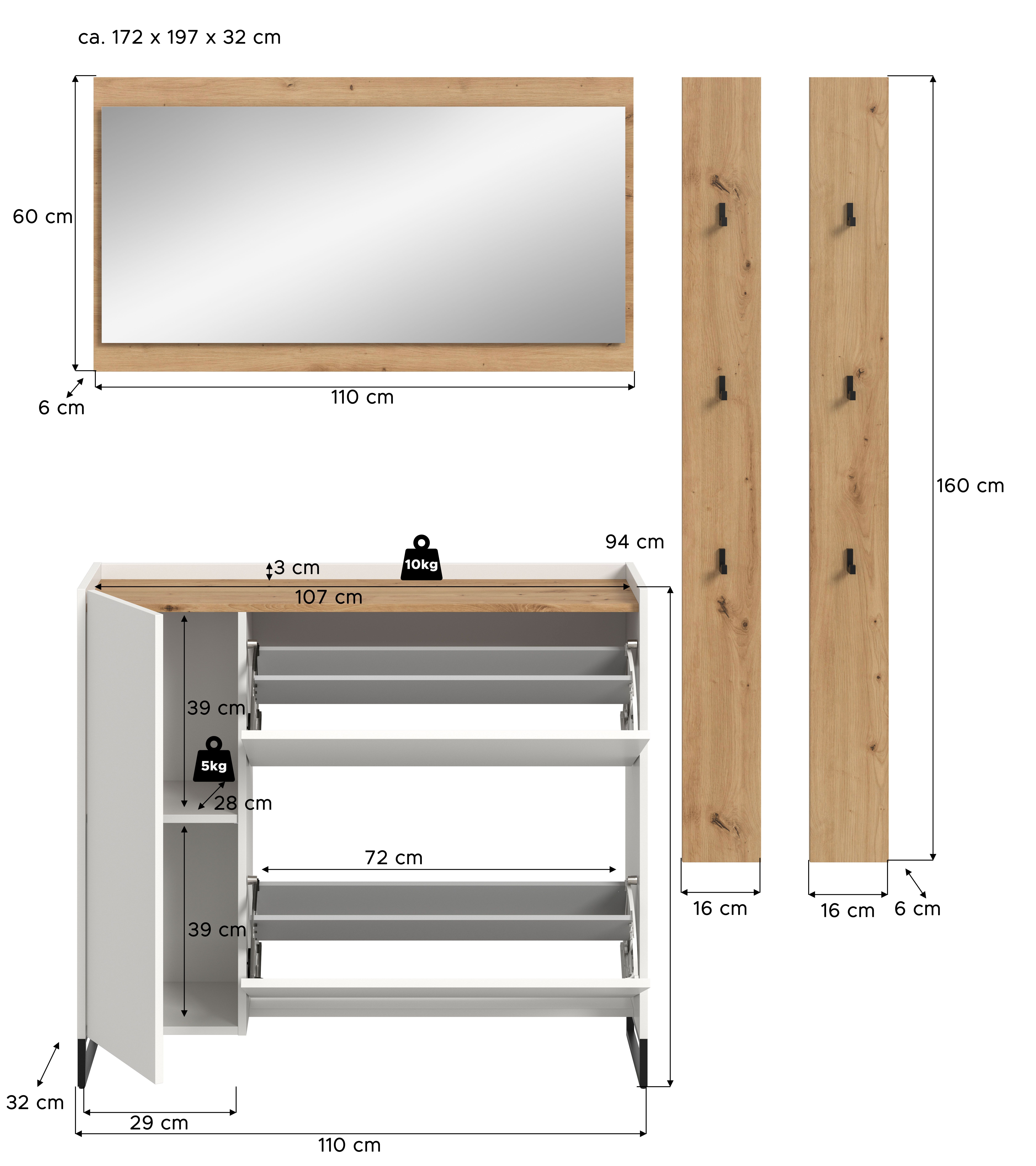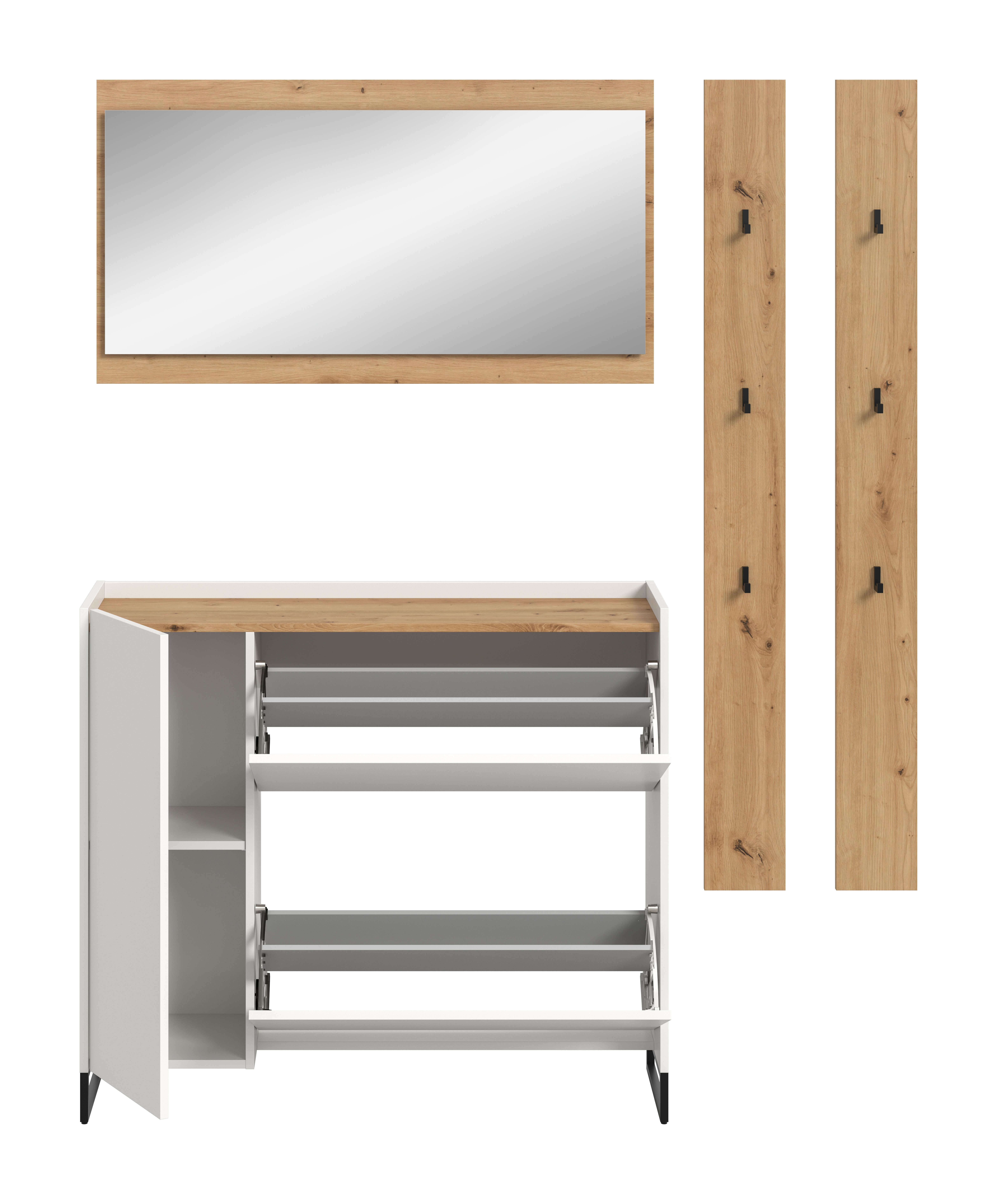 Ce vestiaire combiné 4 éléments se compose d’un meuble à chaussures, d’un miroir et de 2 panneaux portemanteaux – une solution idéale pour disposer d’un bel espace de rangement. Dimensions : L/H/P : 172 x 192 x 32 cm. Le bois composite certifié FSC® est synonyme de durabilité. La surface facile d’entretien et le montage simple de cet ensemble facilitent l’utilisation au quotidien. Il peut être complété par d’autres articles de la série pour un intérieur organisé et stylé.
