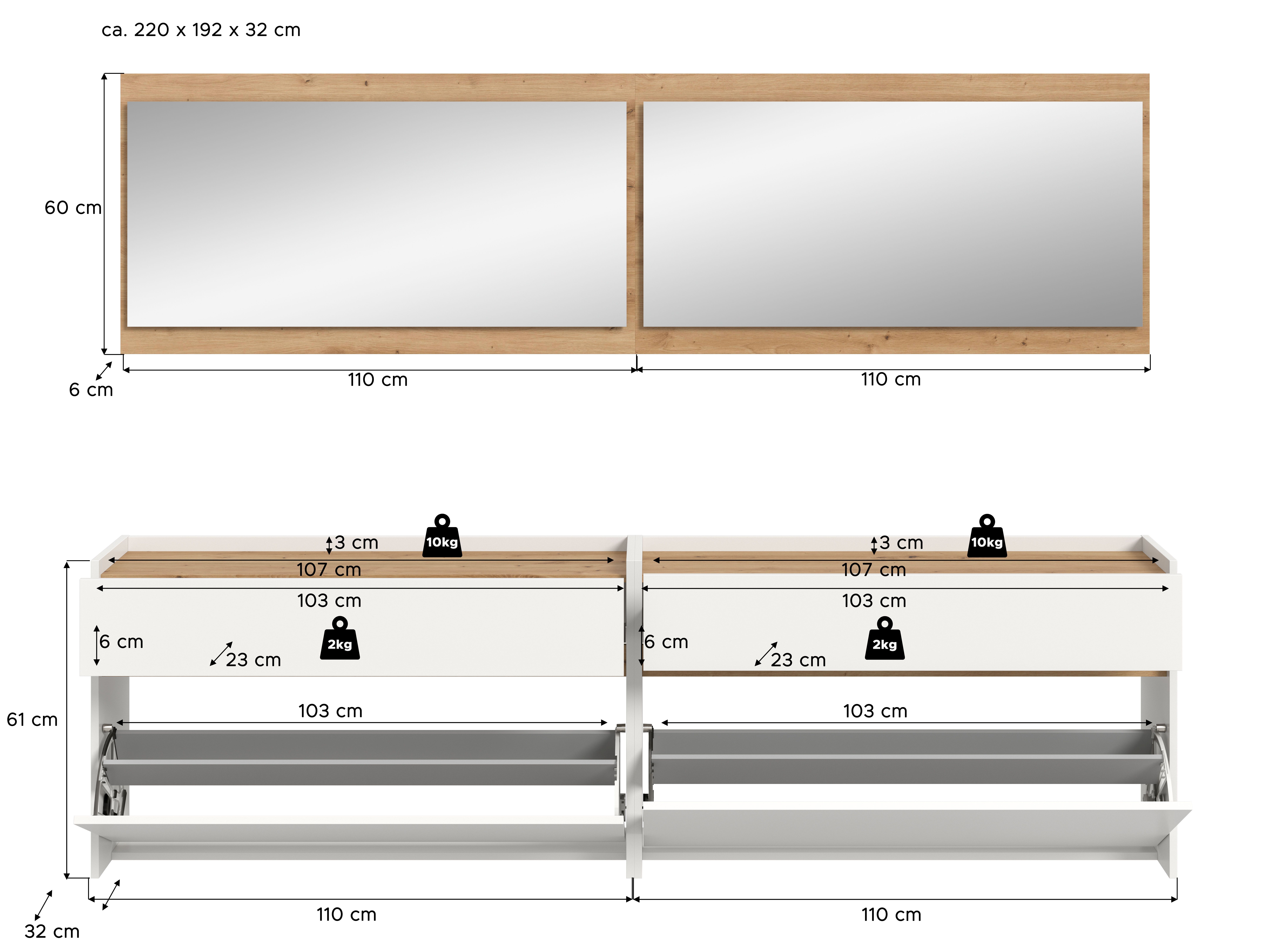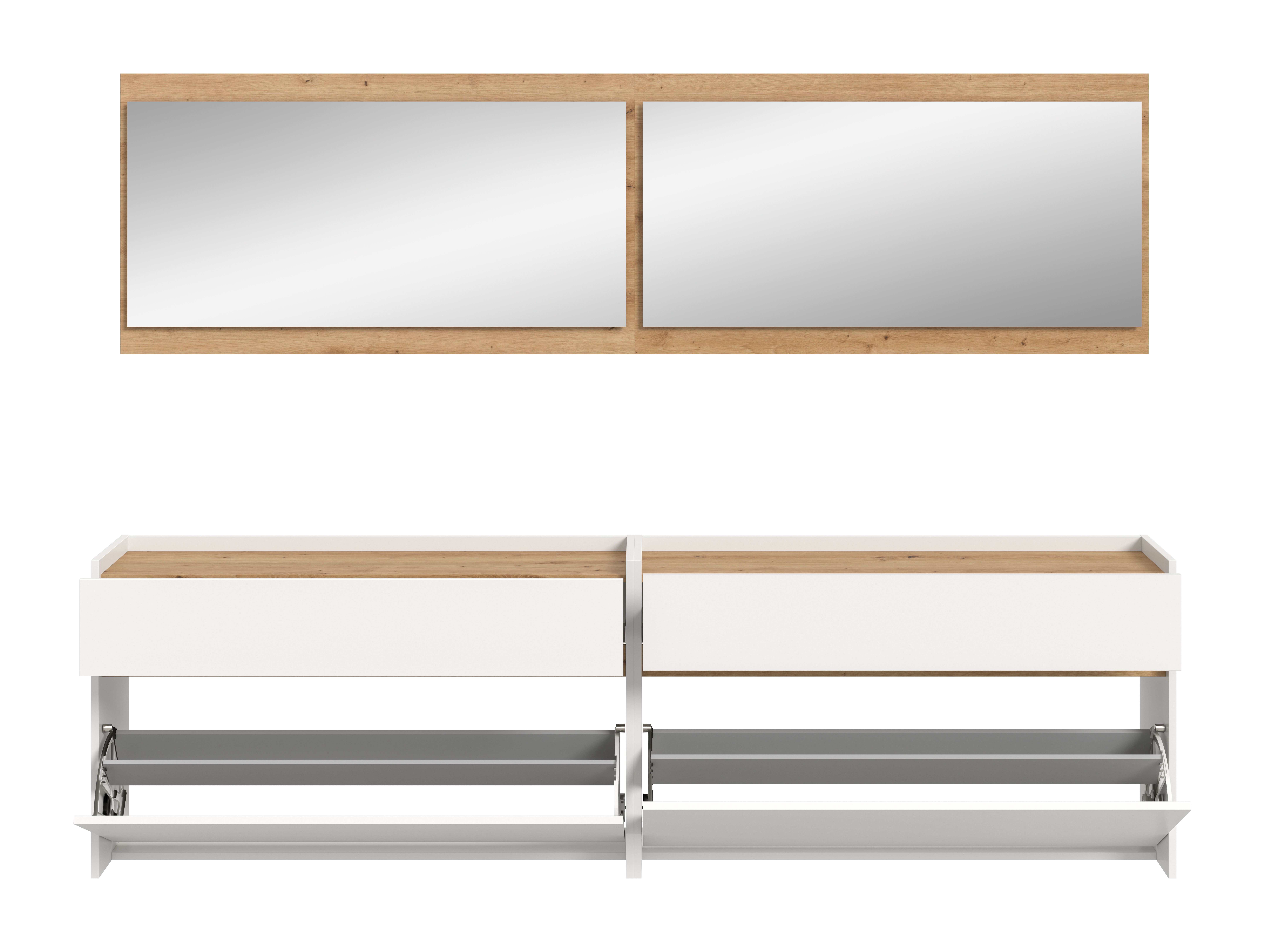 Ce vestiaire combiné 4 éléments se compose de 2 meubles à chaussures et de 2 miroirs – une solution idéale offrant à la fois confort et un vaste espace de rangement. Dimensions : L/H/P : 220 x 192 x 32 cm. Le bois composite certifié FSC® est synonyme de durabilité. Sa surface facile d’entretien et son montage simple font de ce vestiaire combiné un ensemble particulièrement pratique au quotidien. Il peut être complété par d’autres articles de la série pour une entrée bien rangée et stylée.
