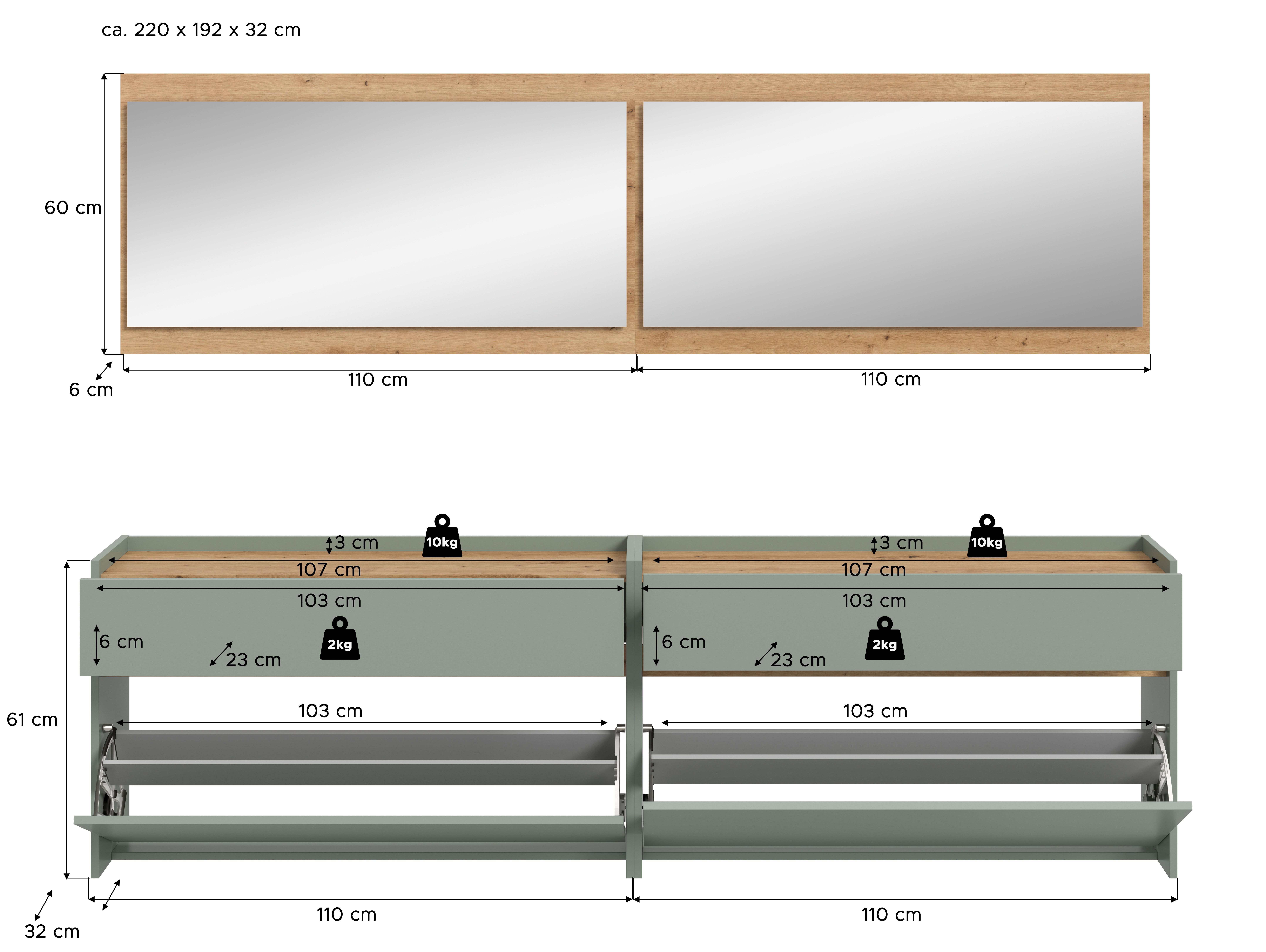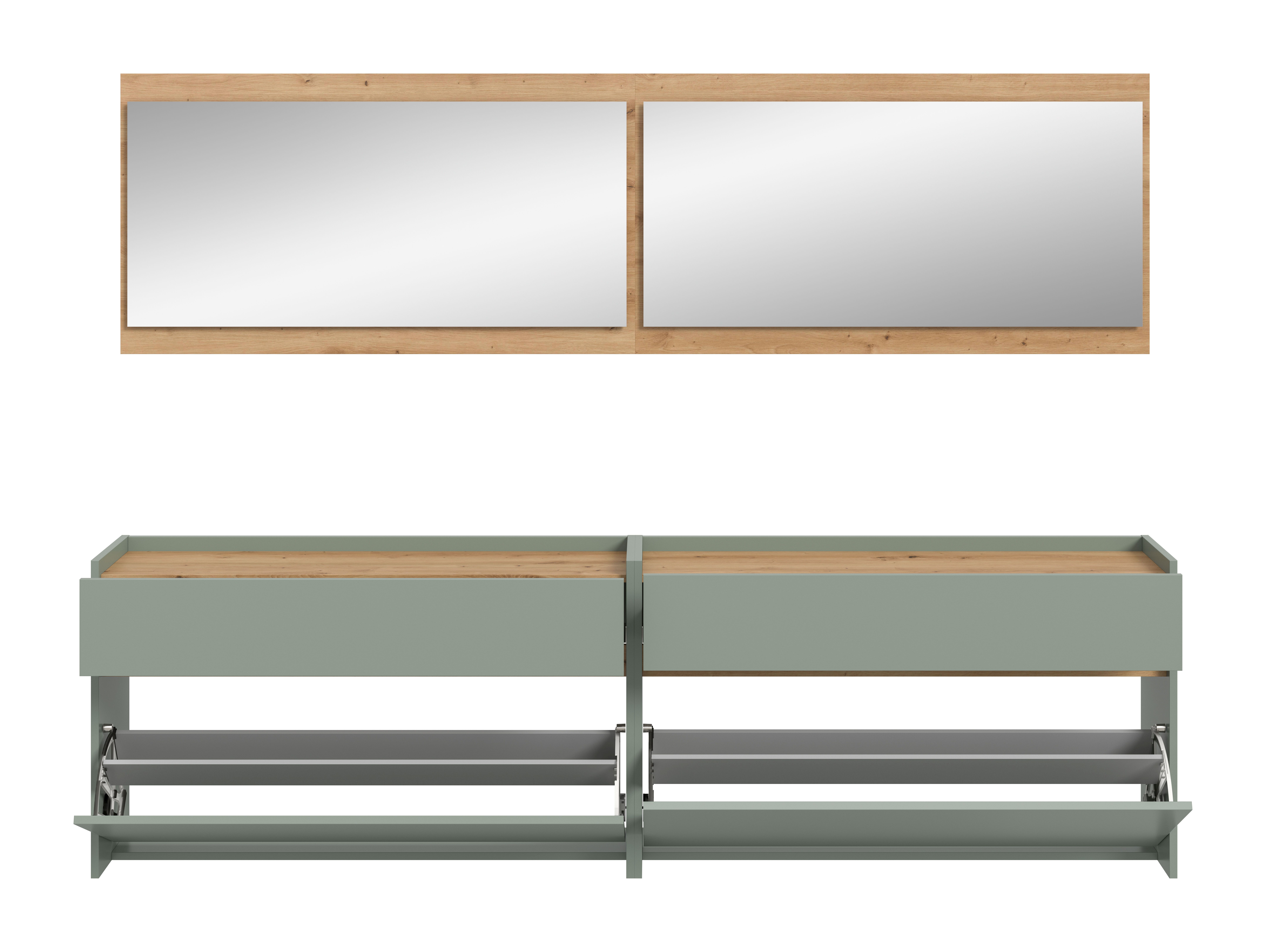 Ce vestiaire combiné 4 éléments se compose de 2 meubles à chaussures et de 2 miroirs – une solution idéale offrant à la fois confort et un vaste espace de rangement. Dimensions : L/H/P : 220 x 192 x 32 cm. Le bois composite certifié FSC® est synonyme de durabilité. Sa surface facile d’entretien et son montage simple font de ce vestiaire combiné un ensemble particulièrement pratique au quotidien. Il peut être complété par d’autres articles de la série pour une entrée bien rangée et stylée.