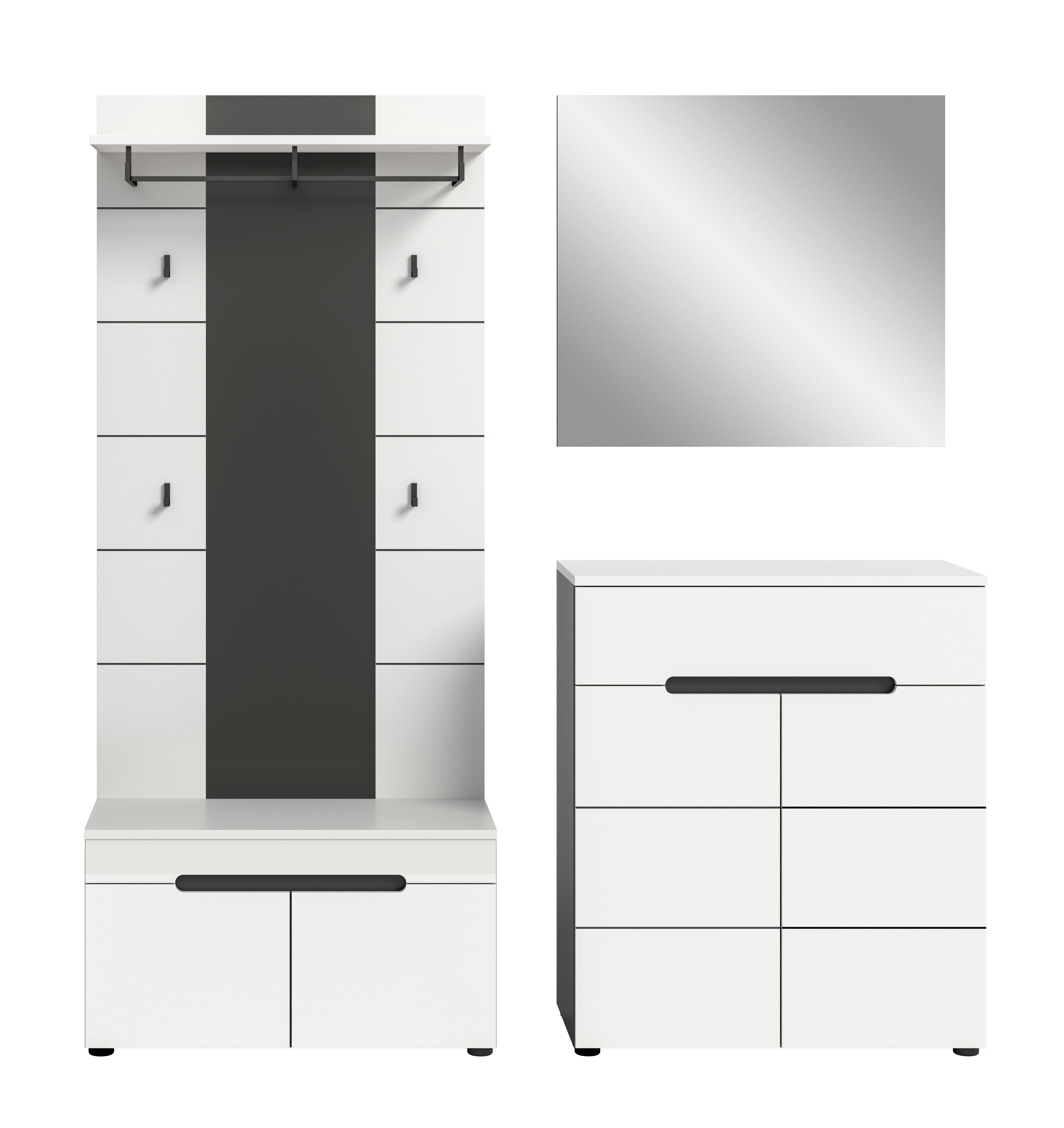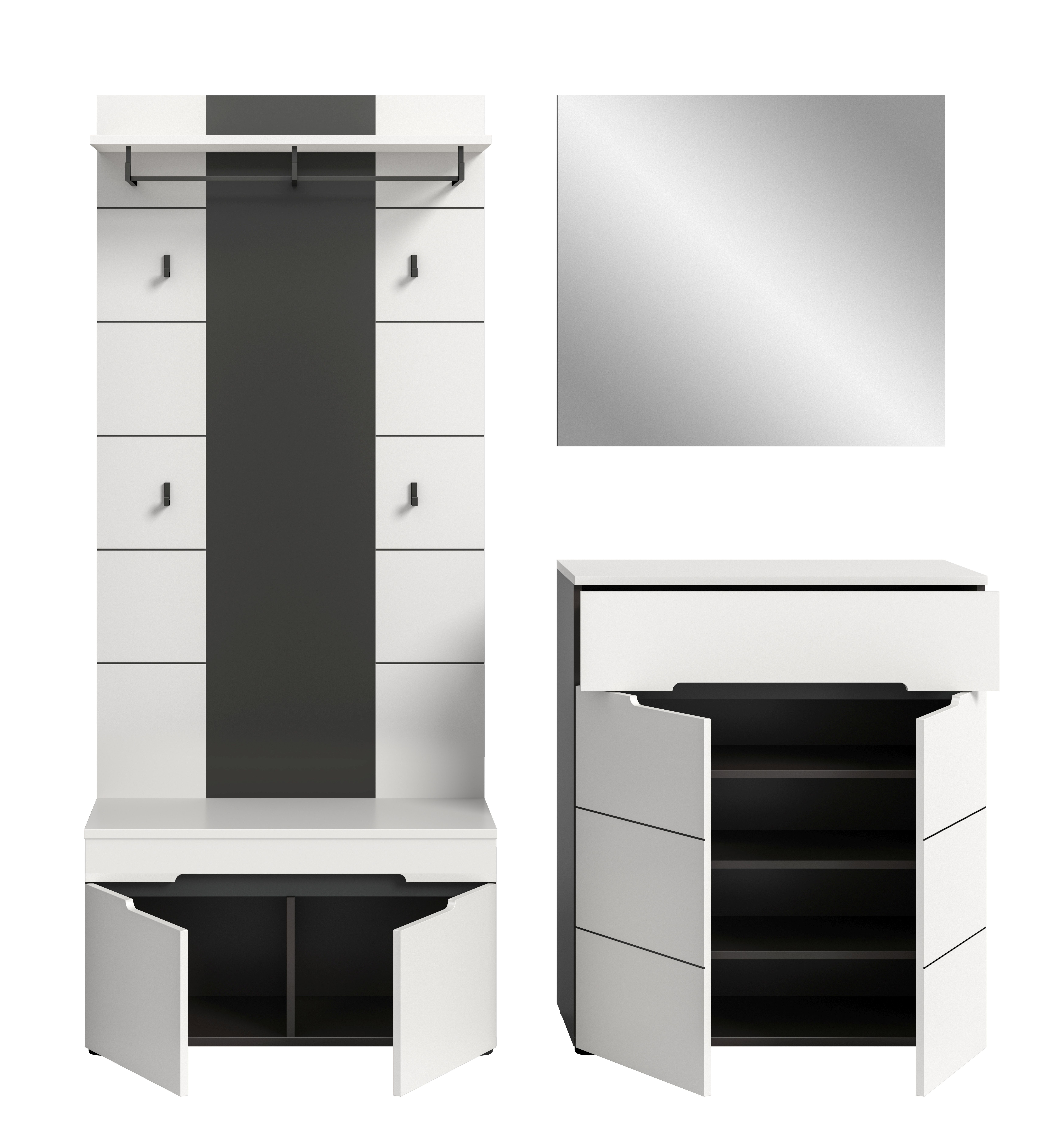 - Ensemble 4 éléments comprenant : 1 banc, 1 panneau portemanteau, 1 meuble à chaussures, 1 miroir