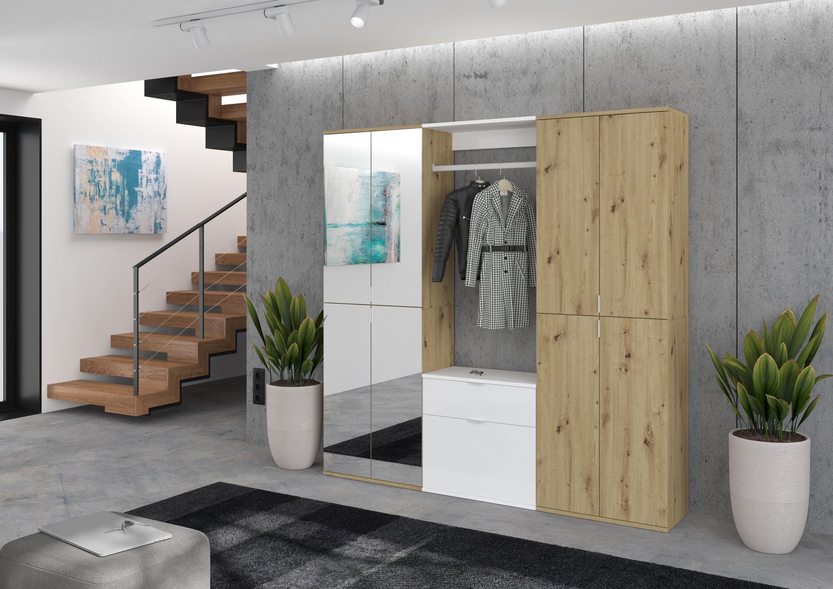 • Design/style : le vestiaire combiné associe la chaleur du décor chêne Artisan à l’élégance intemporelle du ton blanc et au look raffiné de la surface miroir. Cette fusion harmonieuse confère au meuble un charme tendance et accueillant qui s’intègre bien dans différents styles de décoration intérieure.