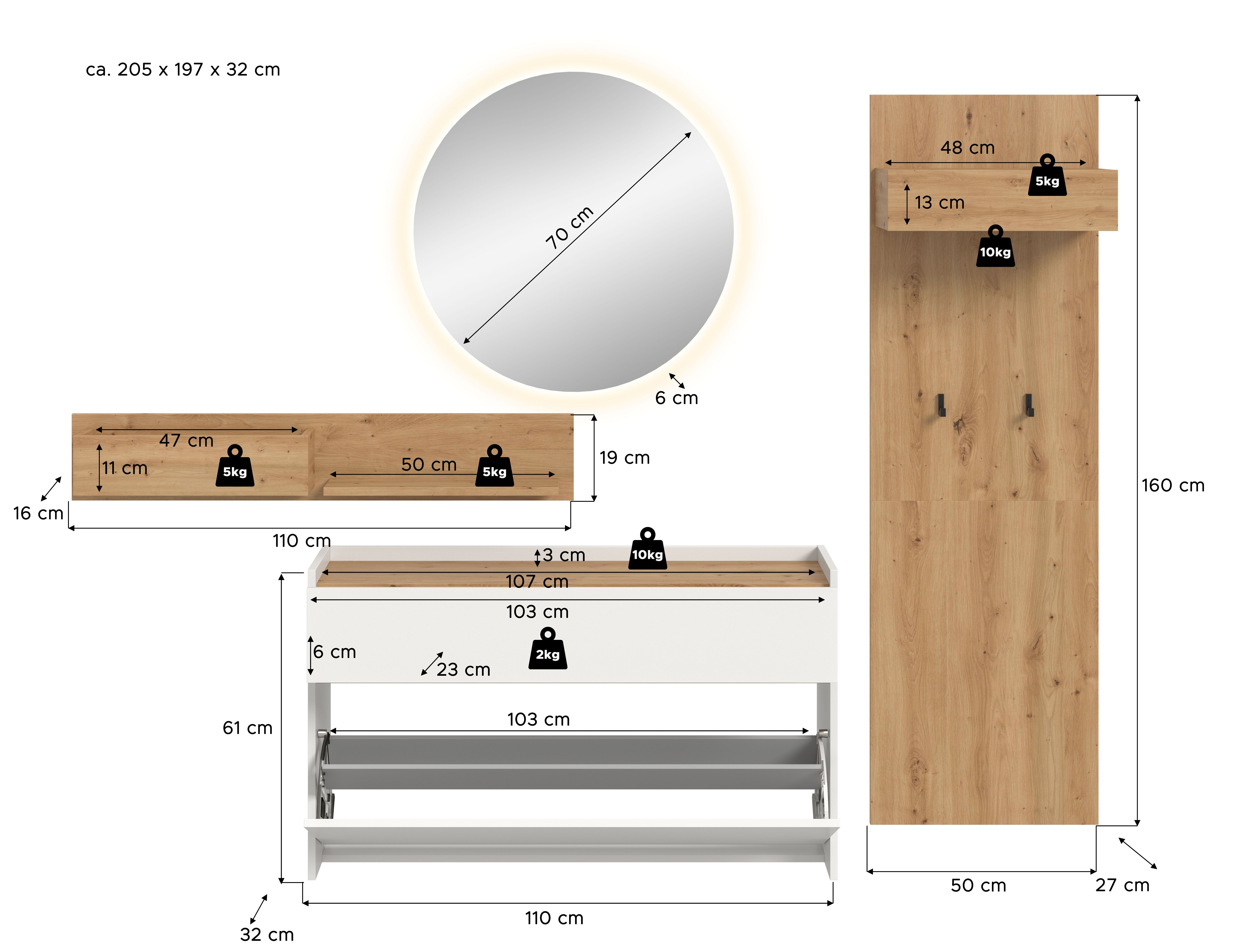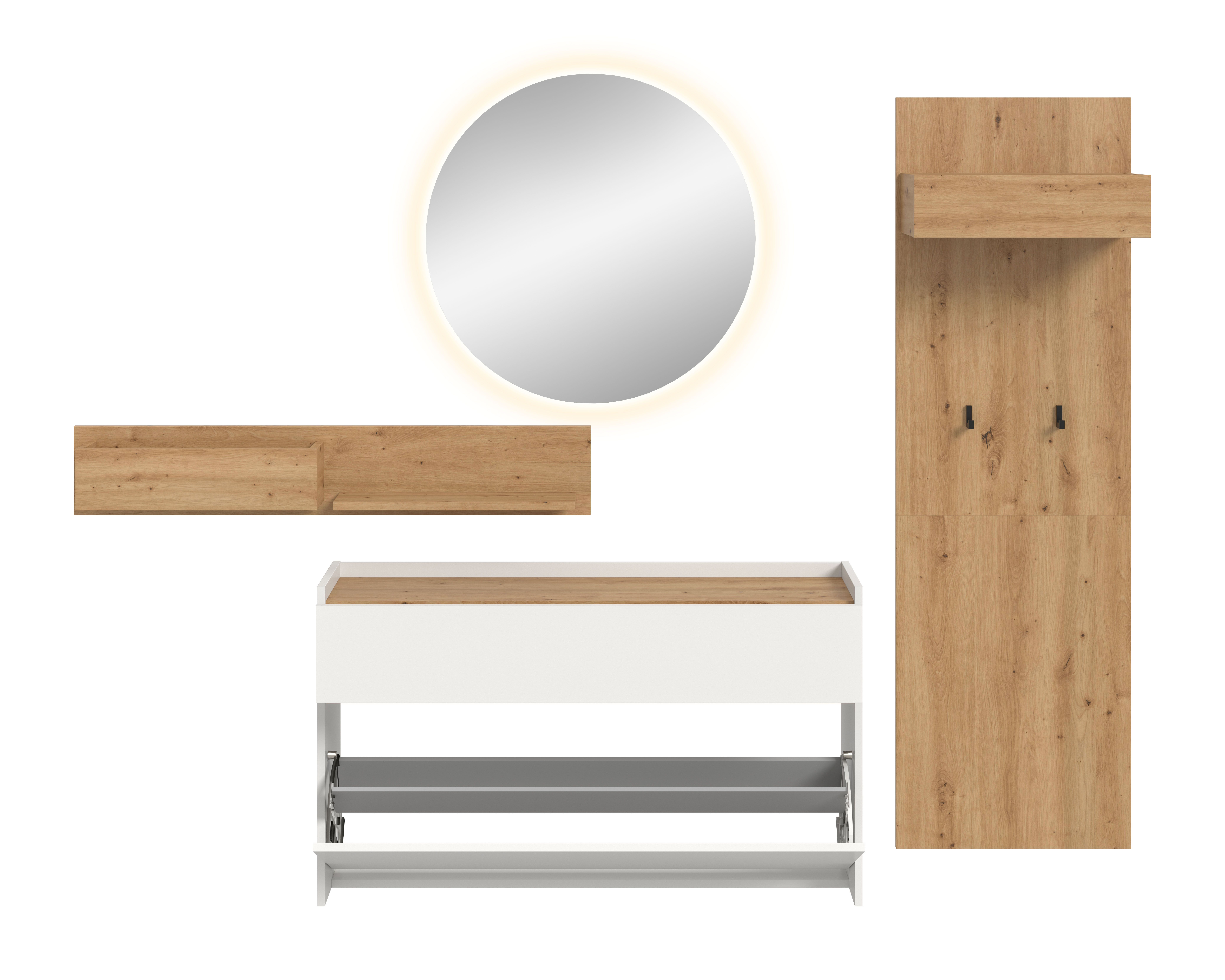 - Ensemble 5 éléments comprenant : 1 meuble à chaussures, 1 étagère murale, 1 miroir, 1 panneau portemanteau, bandeau LED ton blanc chaud 2x 110 cm