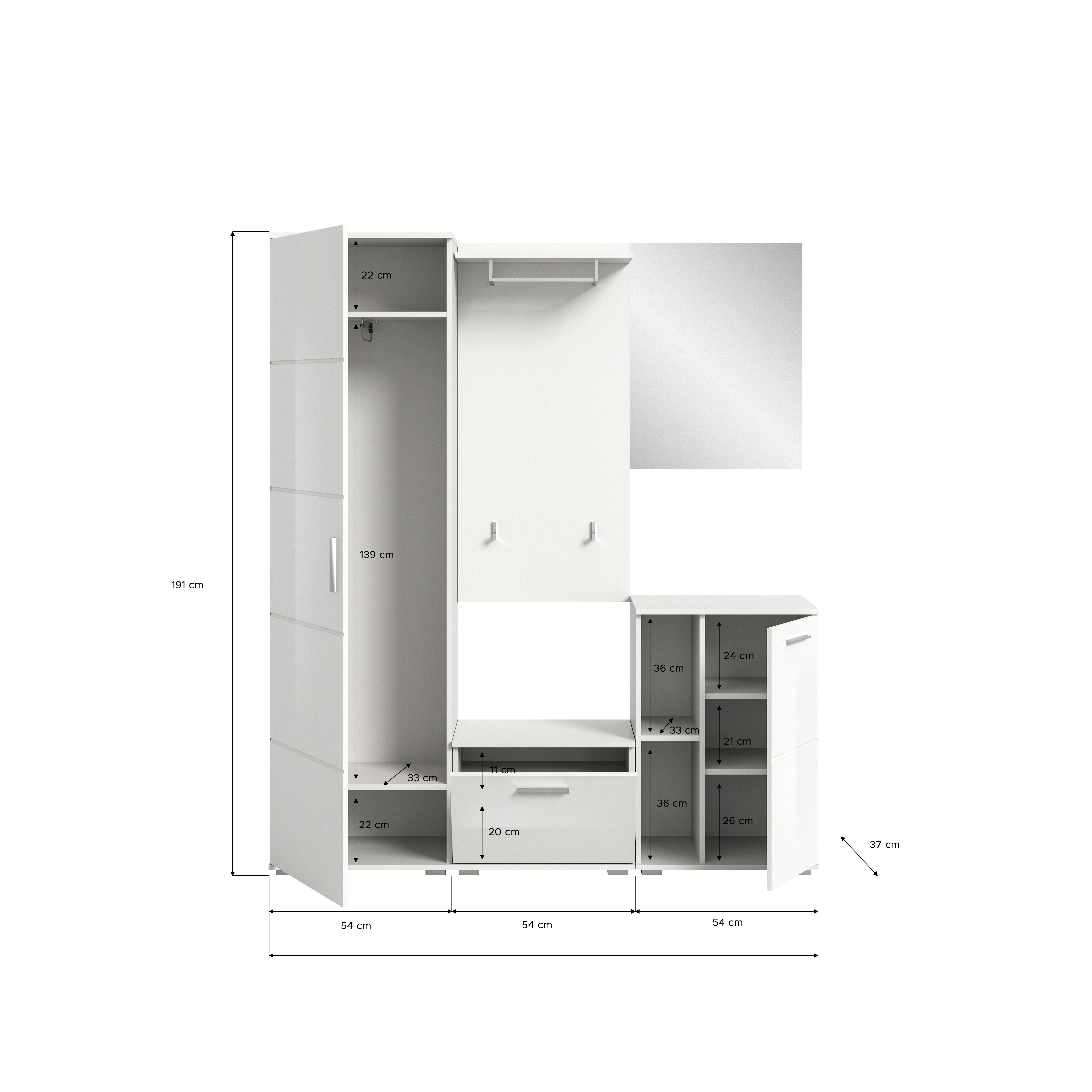 - Design/style : le vestiaire combiné ton blanc et ton blanc ultra brillant séduit par son apparence moderne et élégante. L’association des façades brillantes et de la surface mate confère au vestiaire un joli design tout en contrastes qui s’intègre parfaitement dans une décoration intérieure moderne. Les lignes claires et les formes minimalistes garantissent une élégance indémodable tandis que les poignées aspect chrome confèrent à l’ensemble une touche de raffinement.