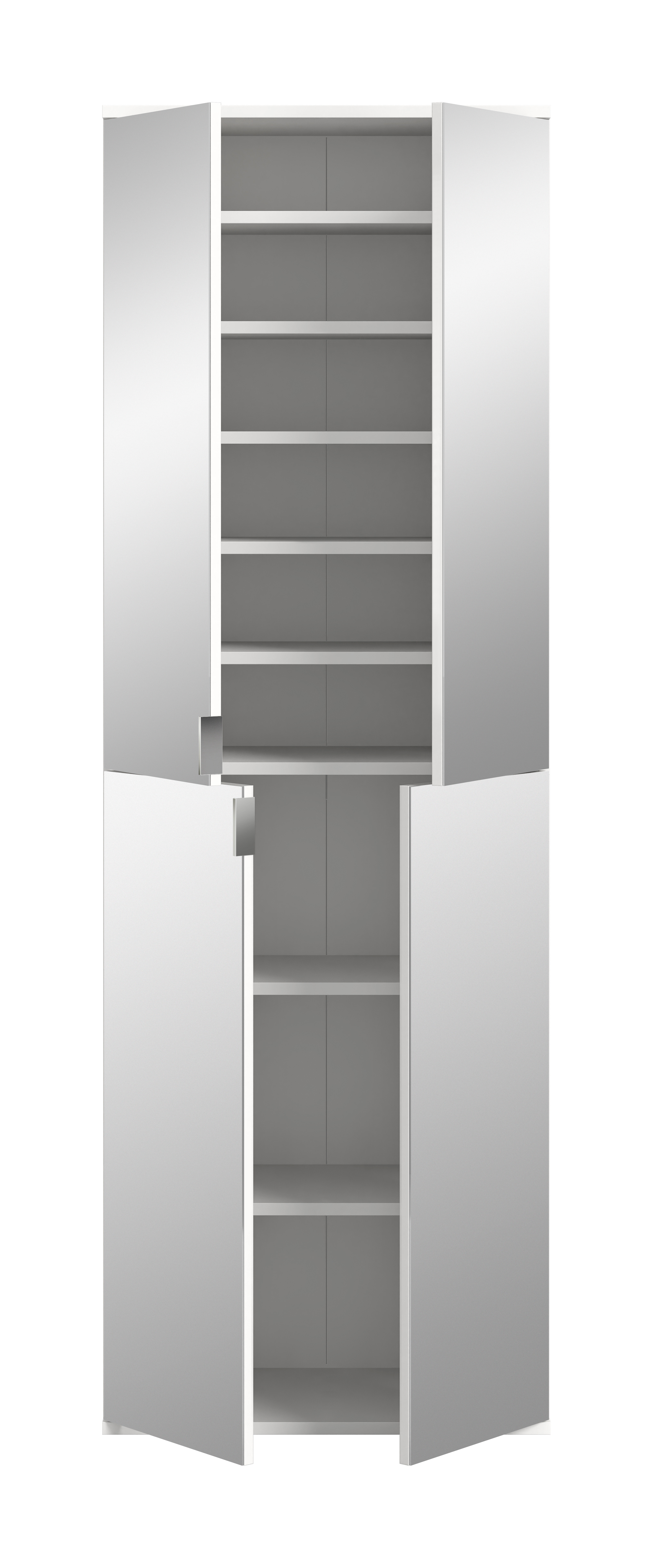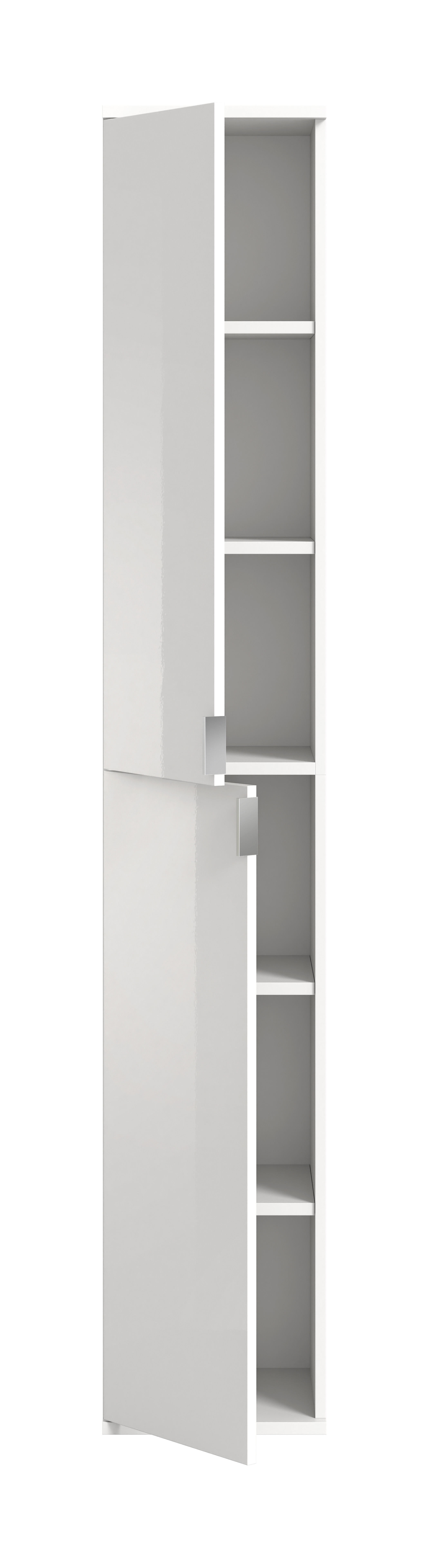 1 armoire d’entrée comprenant 2 portes ton blanc ultra brillant, 7 tablettes amovibles, 1 tablette fixe et 1 barre de penderie
