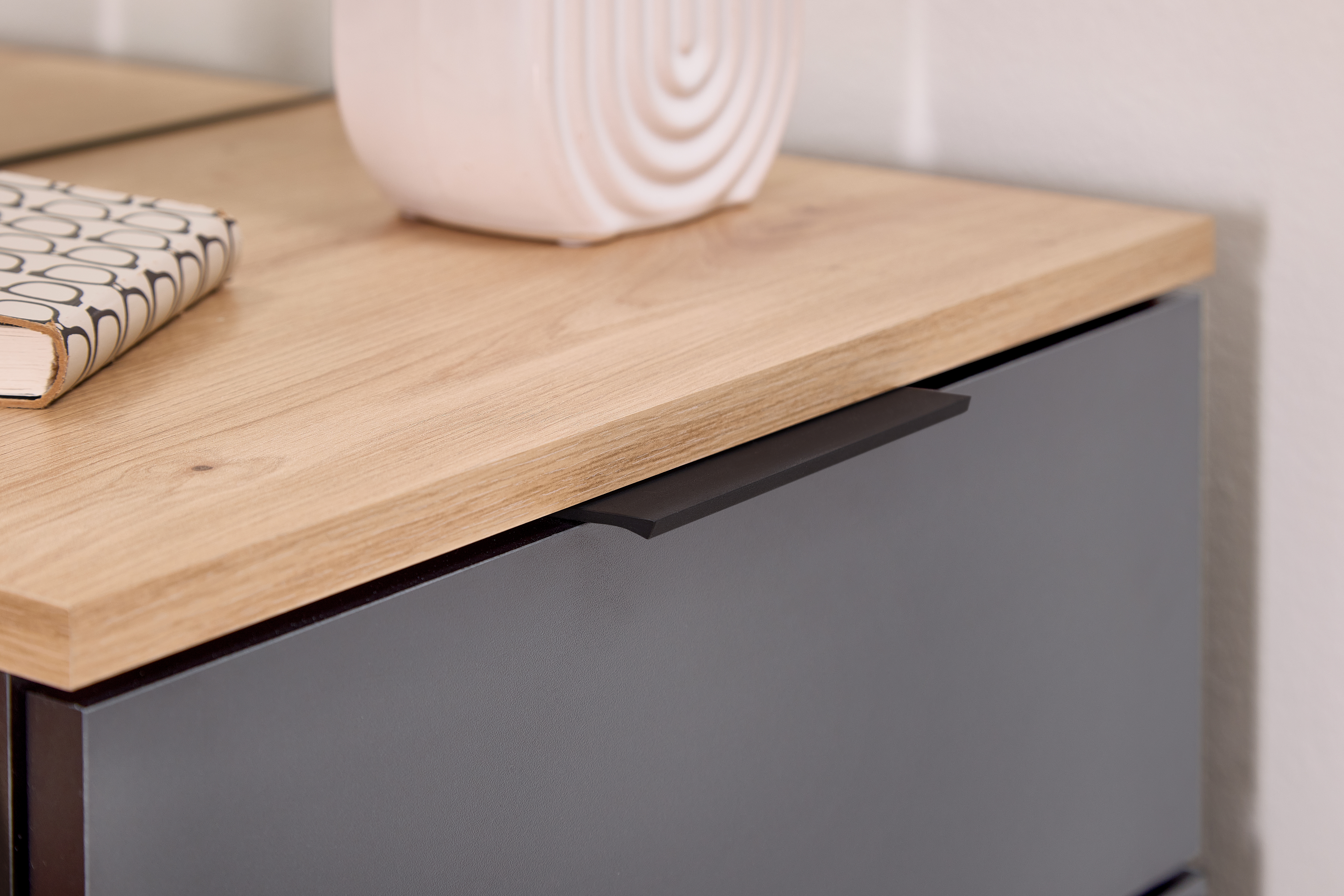 Façade : anthracite, panneau de particules surfacé mélaminé (PPSM) / lamelles décor chêne Artisan, panneau de particules pelliculé