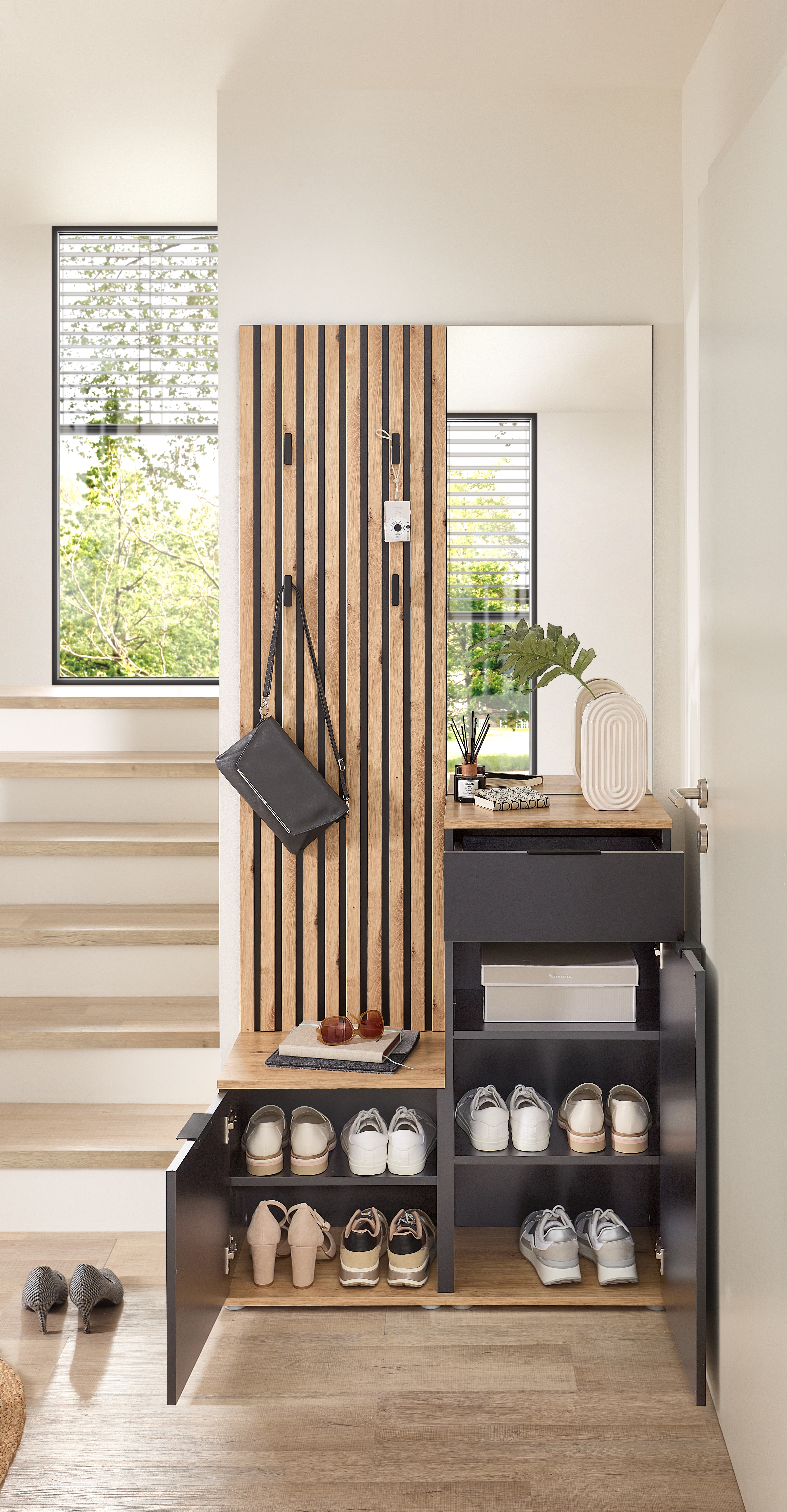 1 meuble à chaussures avec 1 porte, 1 tiroir avec rails inférieurs et 2 tablettes amovibles