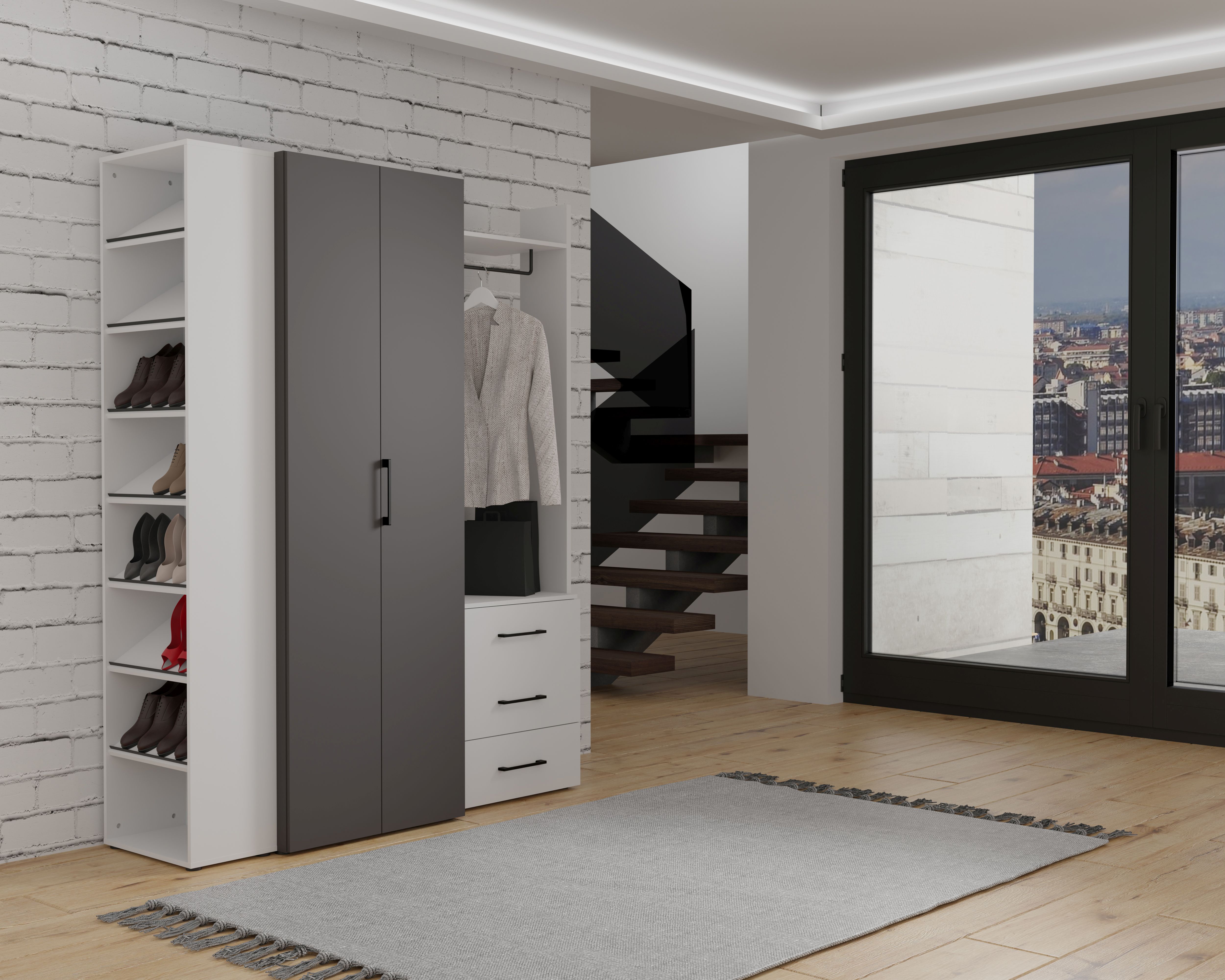 2 portes avec, derrière elles, 1 barre de penderie et 2 tablettes