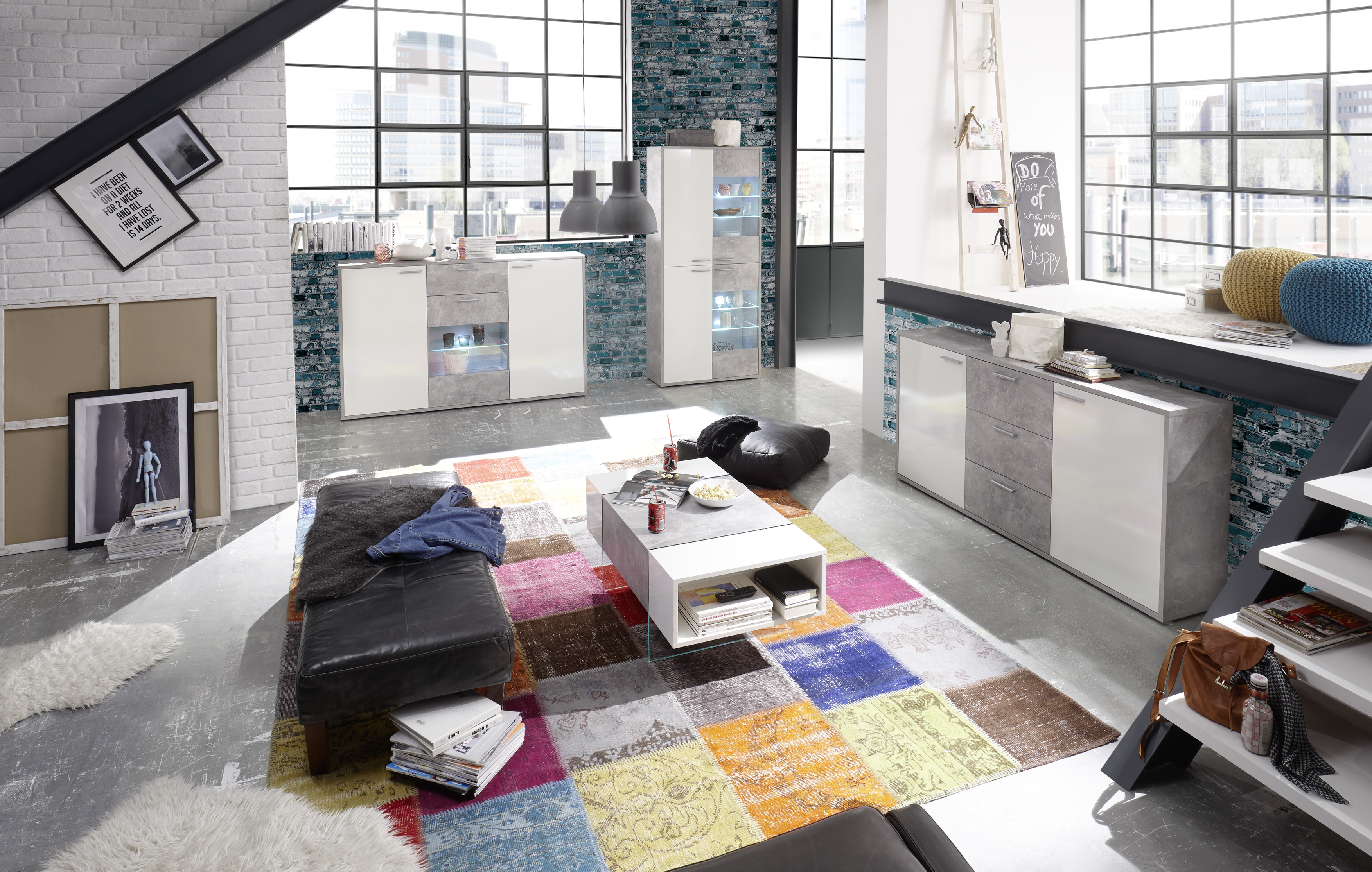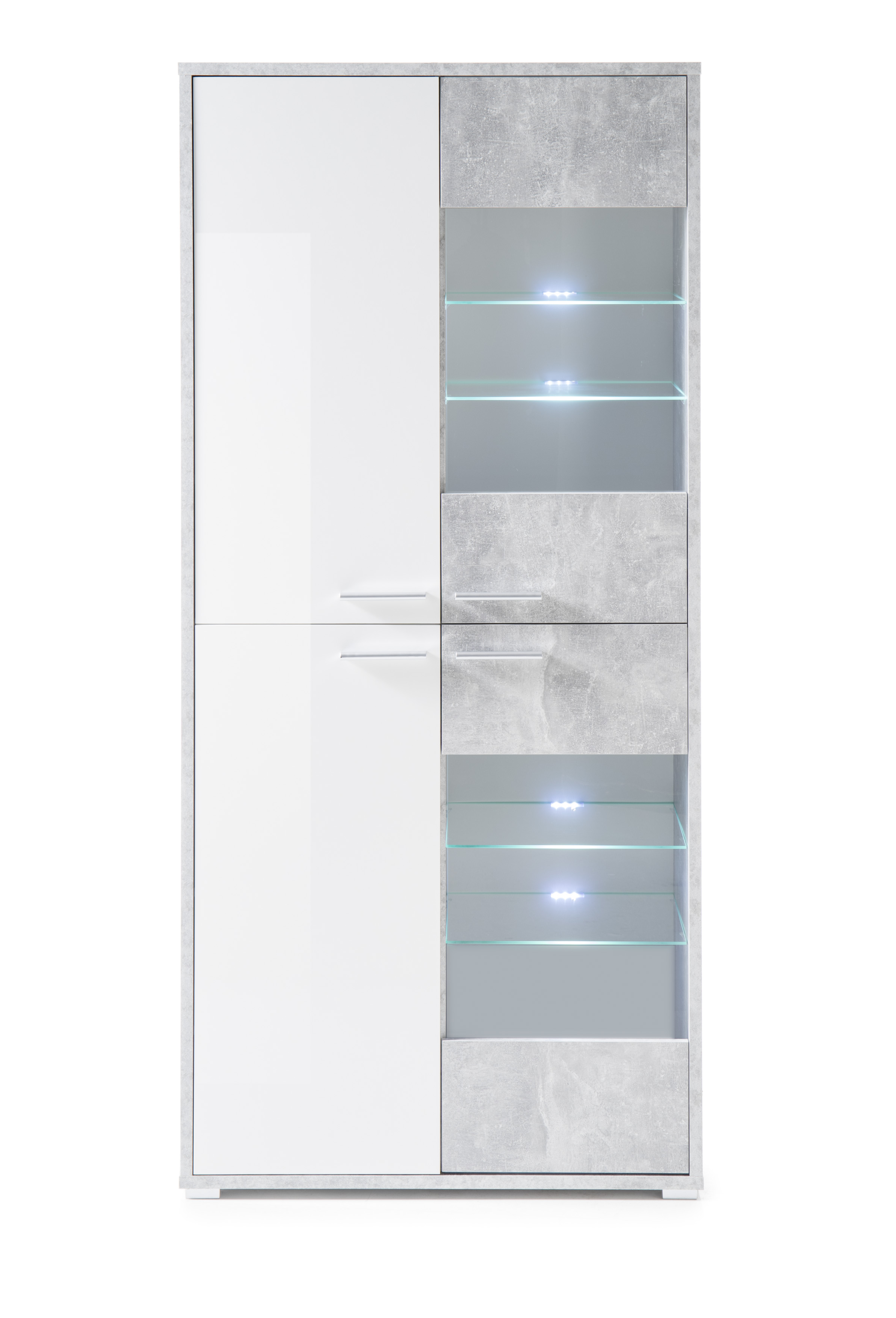 Cette vitrine moderne allie l'aspect urbain du béton à une élégante finition brillante. Le corps et les accents décoratifs en aspect béton apportent une touche tendance, tandis que la façade en blanc brillant éclatant confère à l'ensemble un aspect clair et raffiné. Des poignées argentées viennent compléter le design et apportent une touche élégante et moderne à la vitrine. Idéale pour présenter de manière ordonnée et décorative de la vaisselle, des objets de décoration ou des pièces de collection.