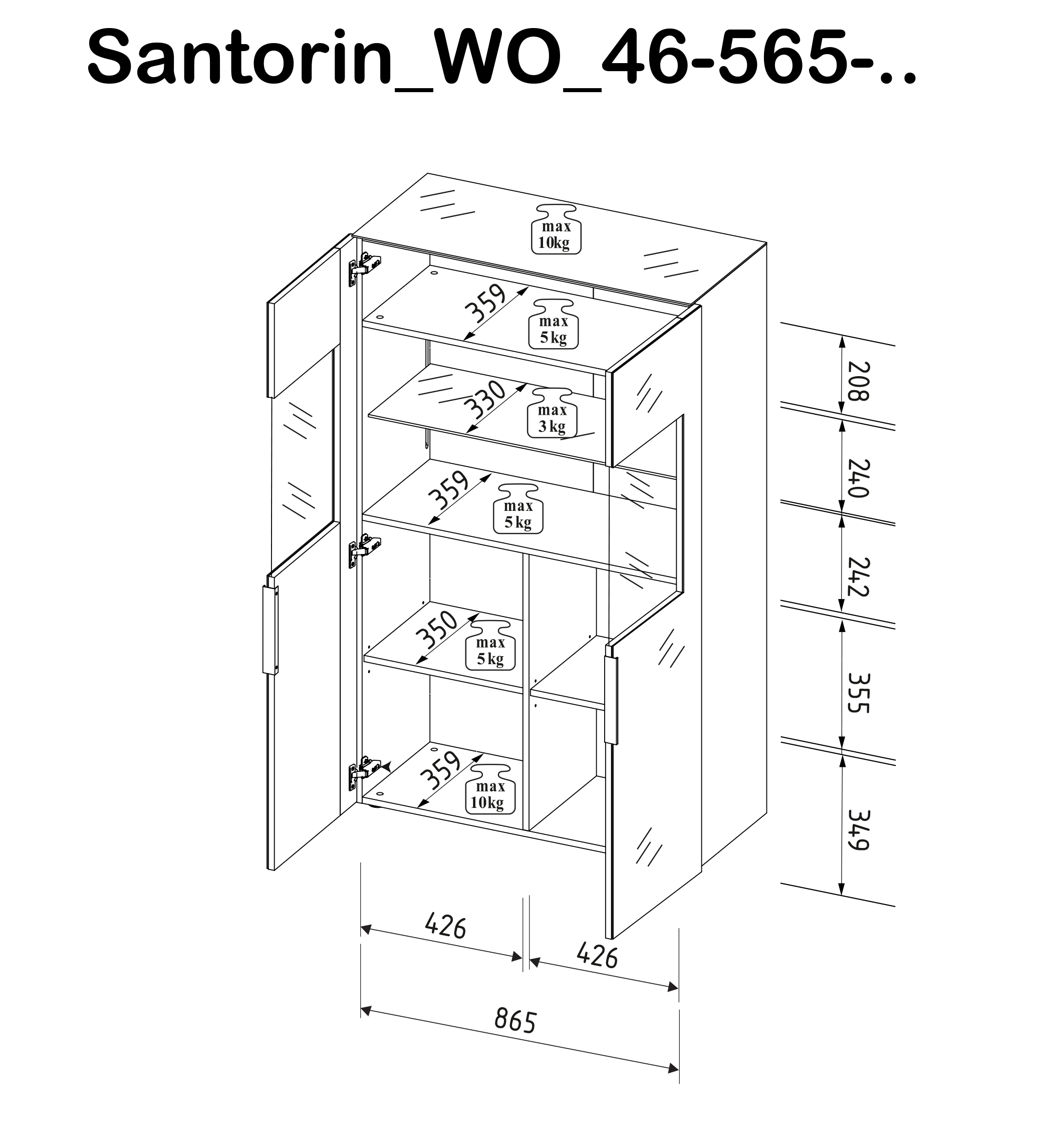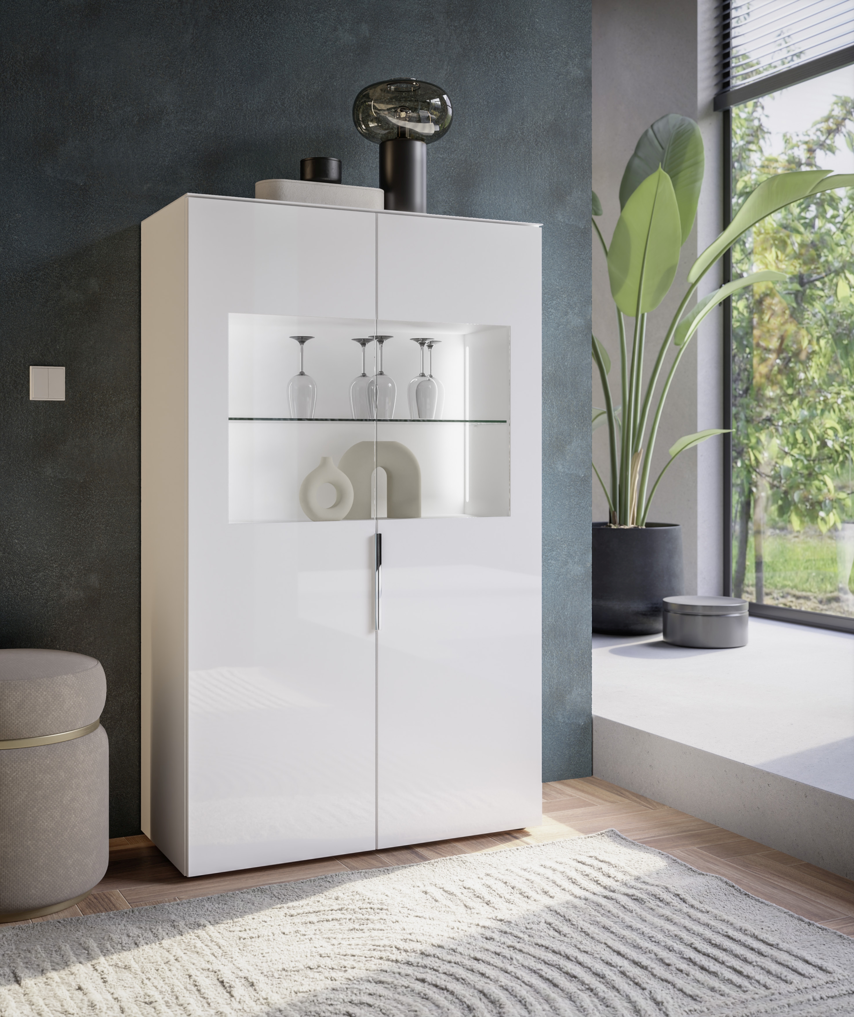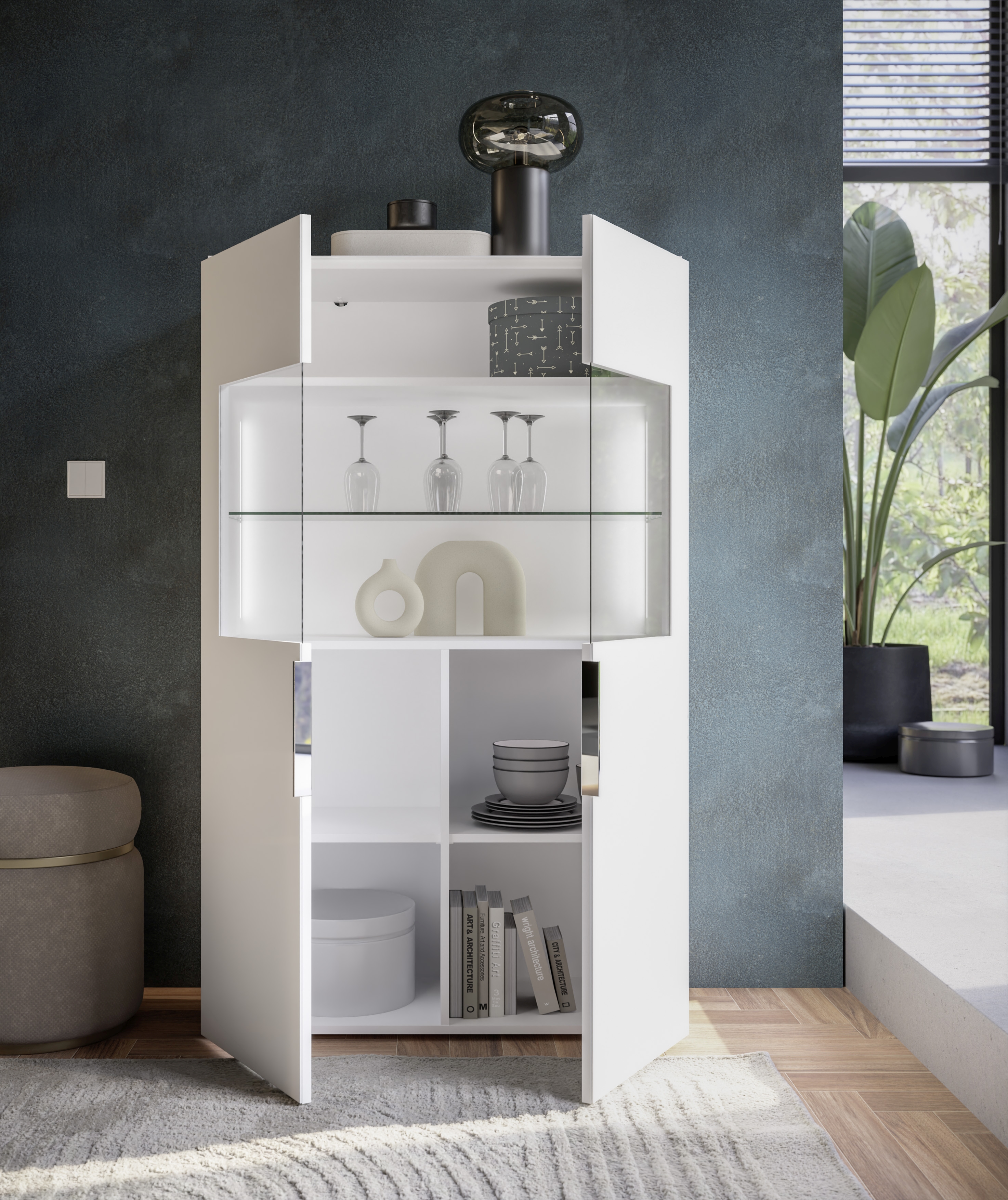 La vitrine est équipée de 2 portes partiellement vitrées, derrière lesquelles se trouvent 1 étagère en verre et 2 étagères. L'éclairage intégré met en valeur vos objets exposés et crée une ambiance chaleureuse dans la pièce.