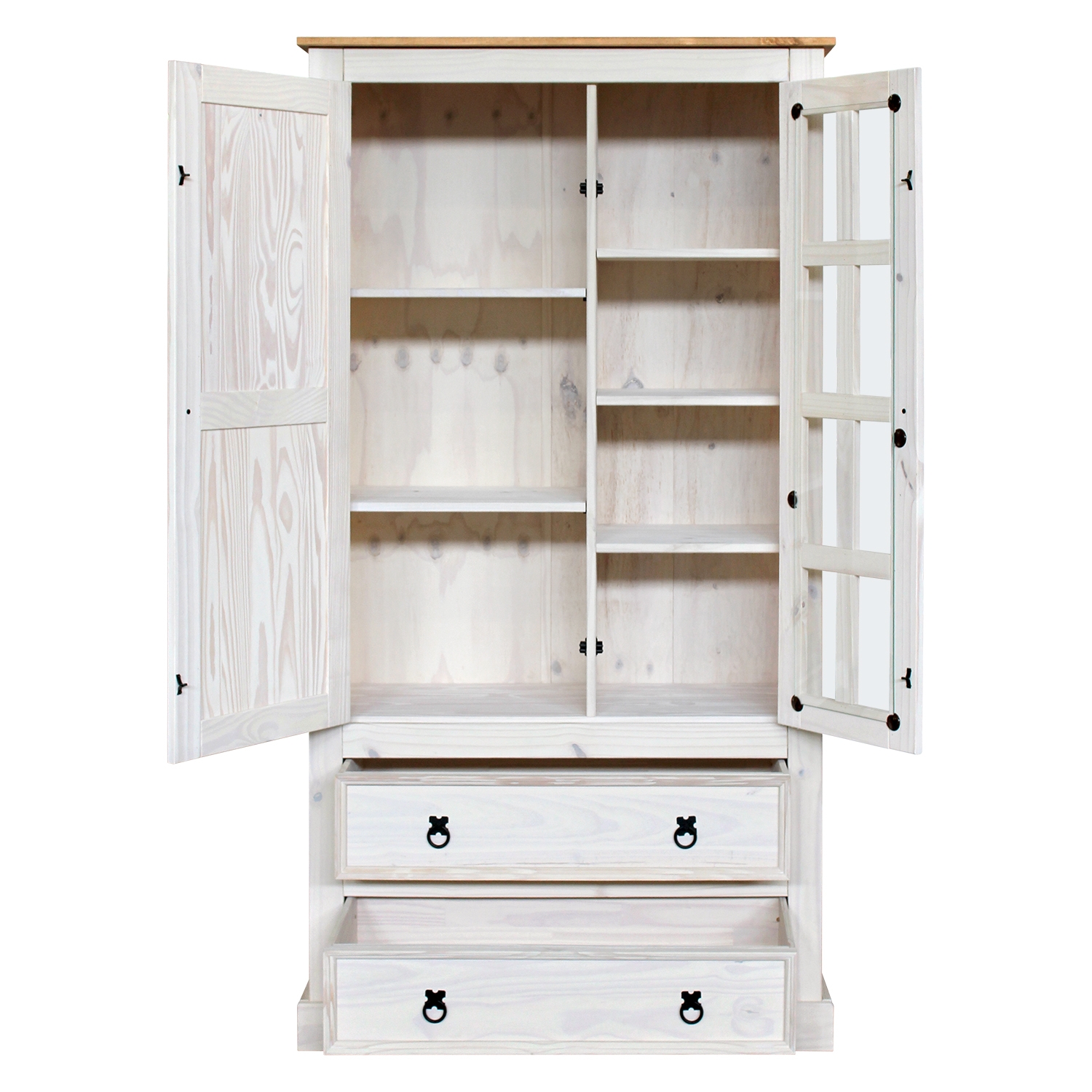 Ce grand meuble vitrine fera régner l'ordre avec élégance dans votre espace de vie. Il est fabriqué en pin massif. Derrière les deux portes, dont l’une partiellement vitrée, la décoration et les effets personnels trouveront facilement leur place. Dans les deux tiroirs avec poignées décoratives en métal, vous pourrez ranger tout ce que vous ne souhaitez pas montrer. La vitrine offre un bel espace de rangement et une atmosphère particulière qui garantiront une ambiance agréable dans vos pièces.