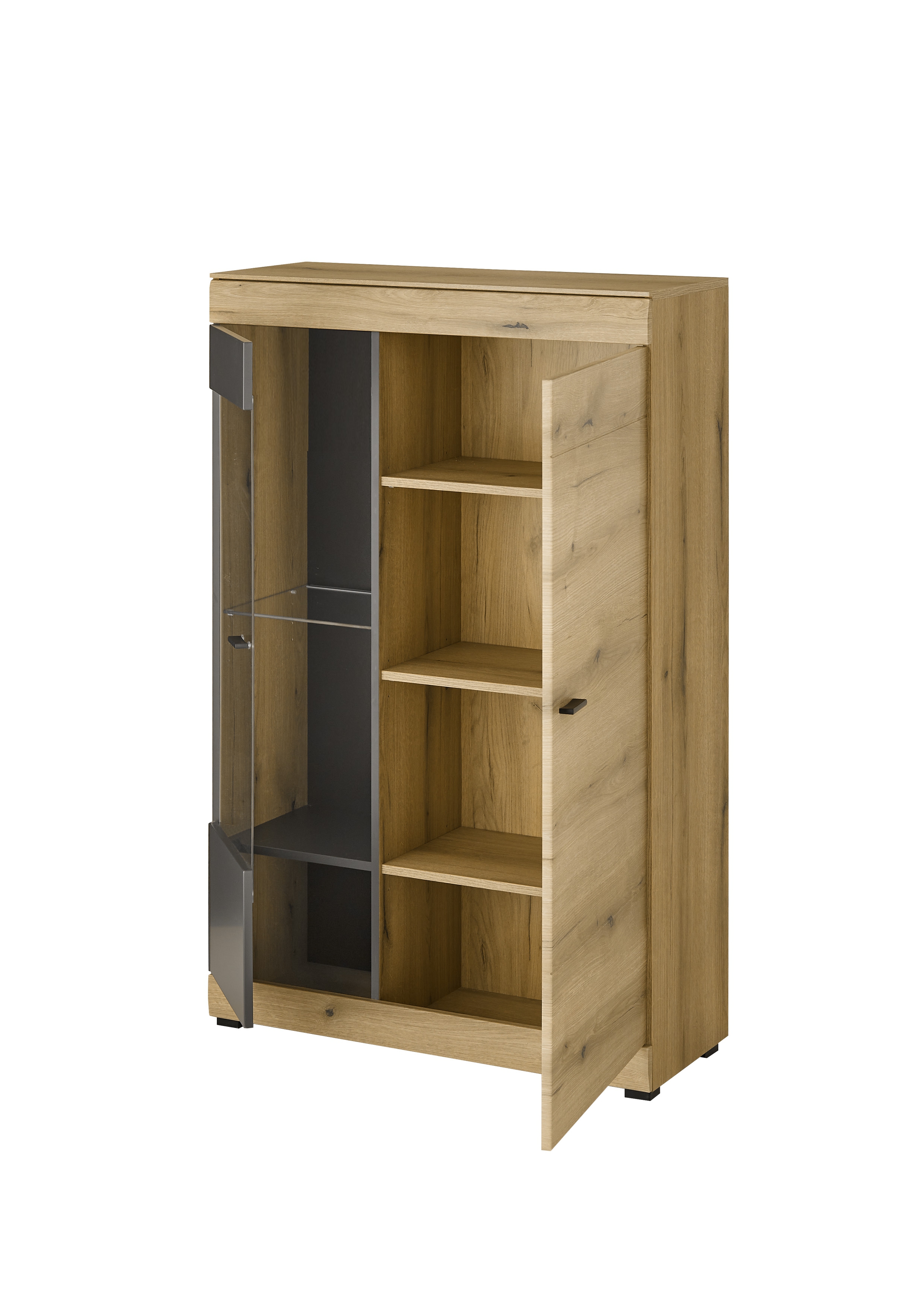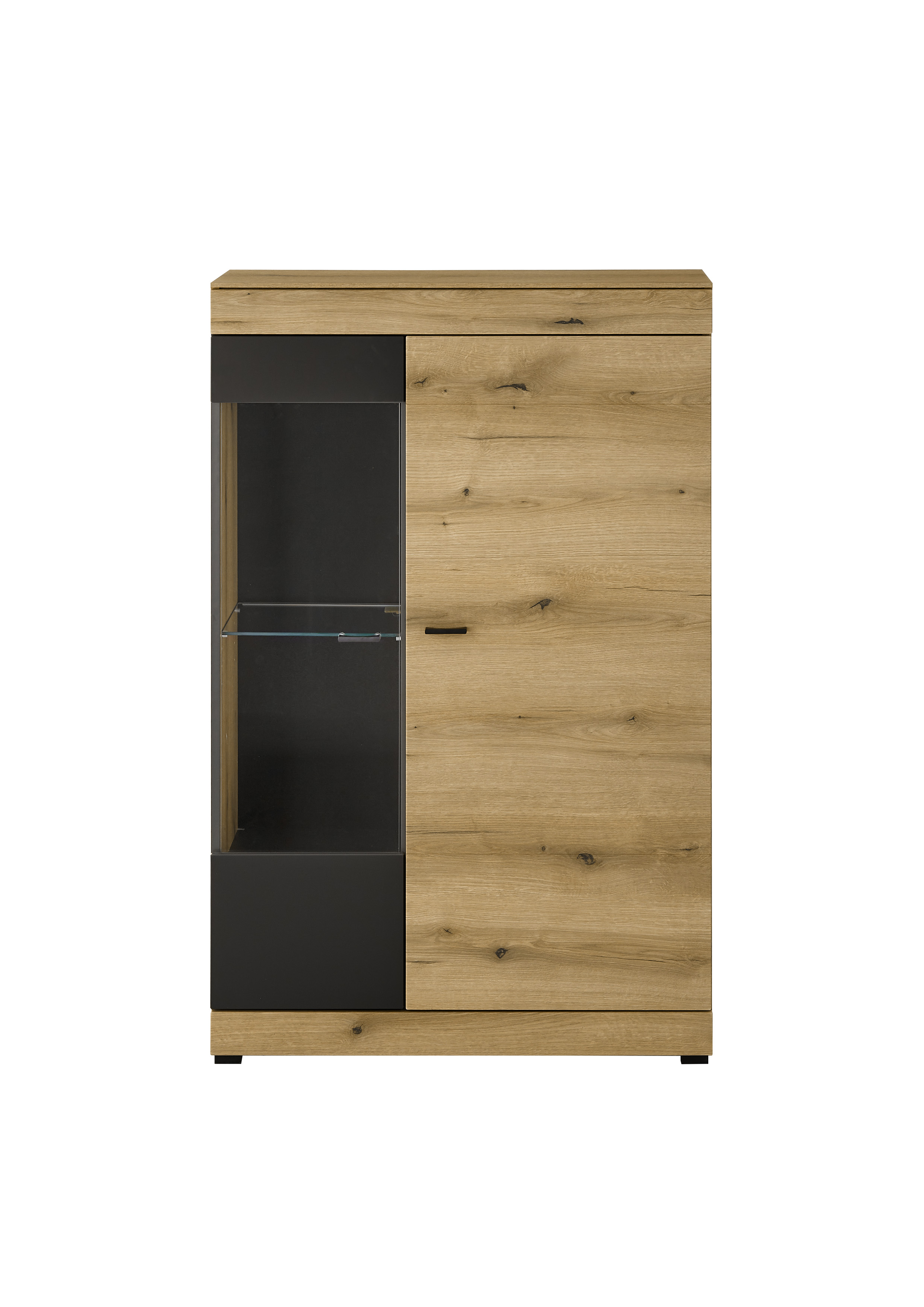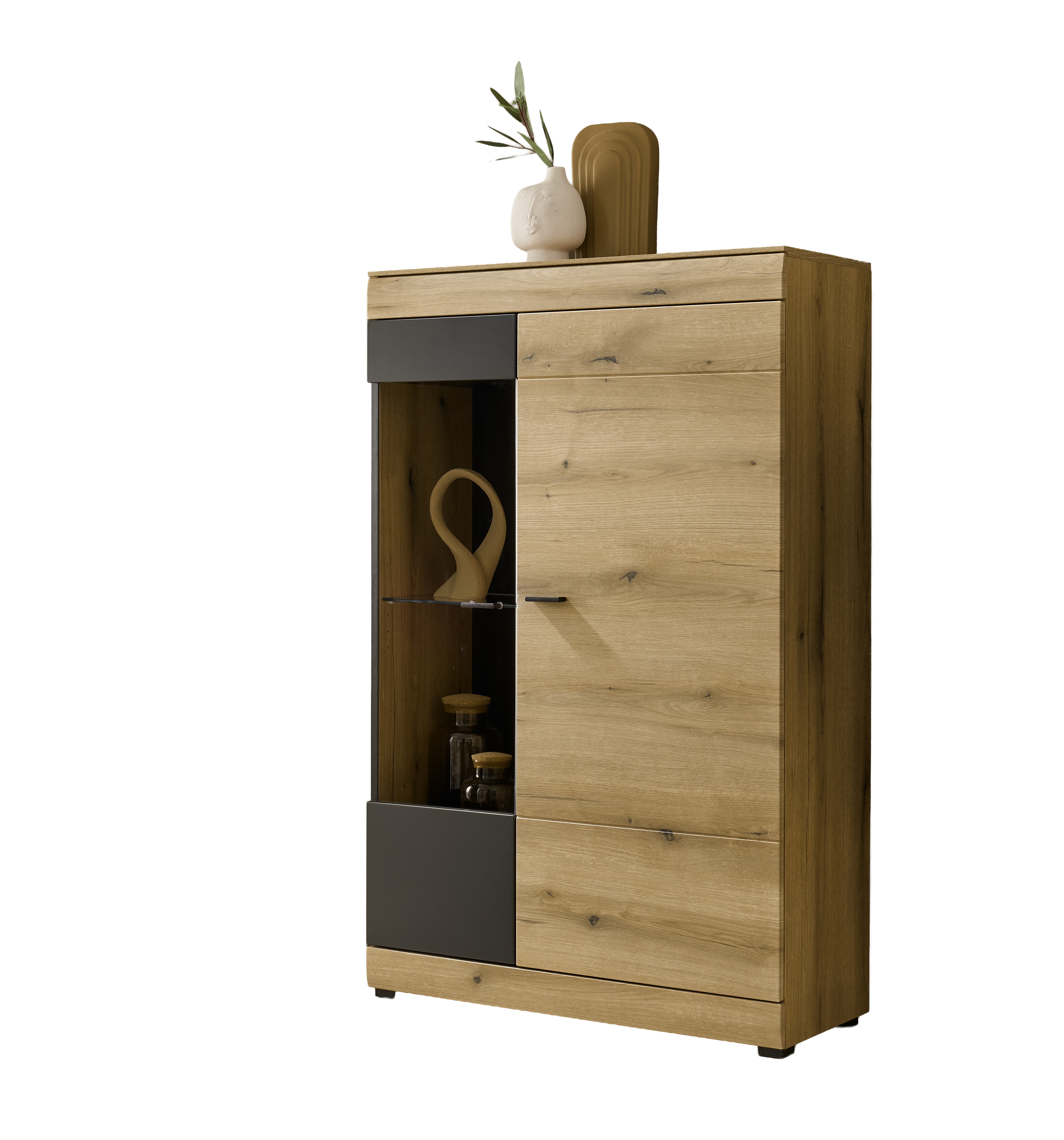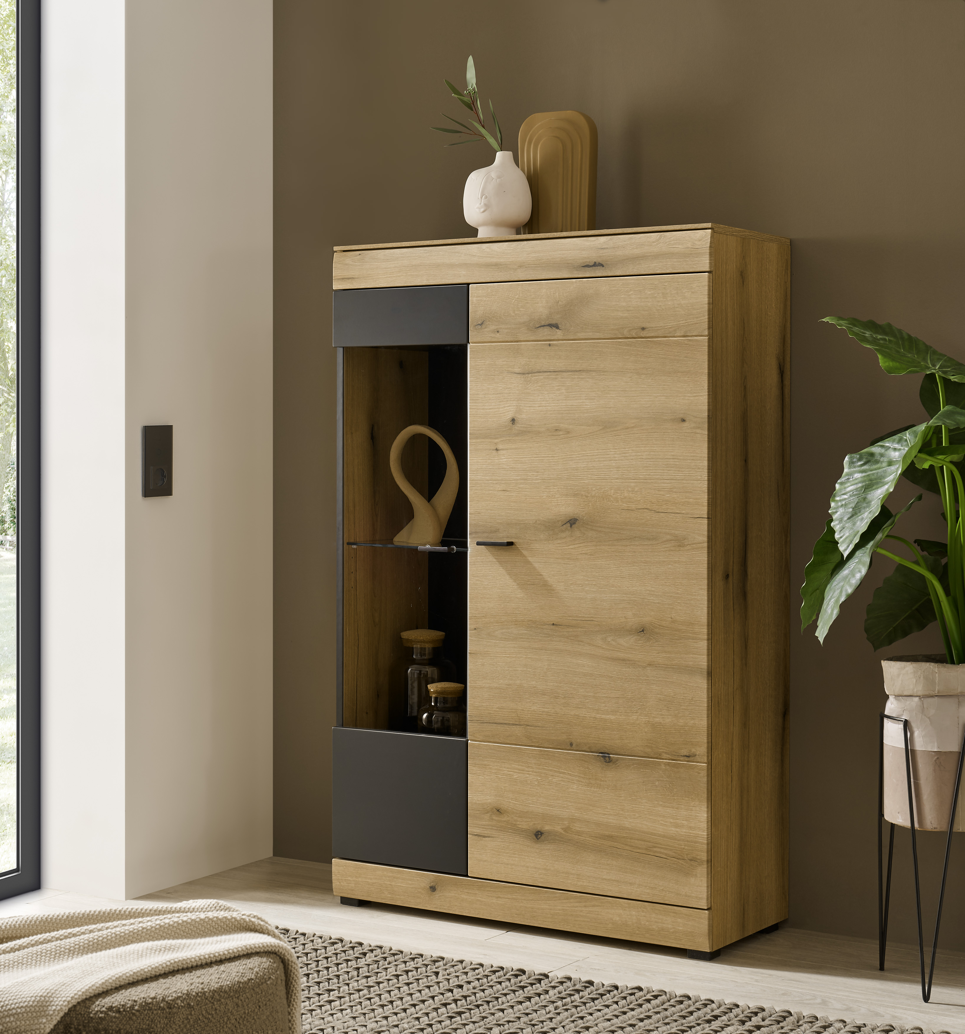 Le programme de mobilier allie design moderne, fabrication de haute qualite et fonctionnalite polyvalente. Les facades en MDF Evoke Chene thermoforme creent une apparence naturelle et chaleureuse, sintegrant harmonieusement dans differents concepts damenagement. Le corps et les appliques en imitations bois Evoke Chene, associes a des details gris graphite mats, apportent des accents elegants, tandis que les poignees metalliques noires completent le design. Le meuble offre un rangement bien pense et des possibilites dutilisation flexibles pour le salon, la salle a manger ou le couloir. Lassociation de materiaux durables et dun style intemporel fait de chaque piece un veritable point fort dans la piece.